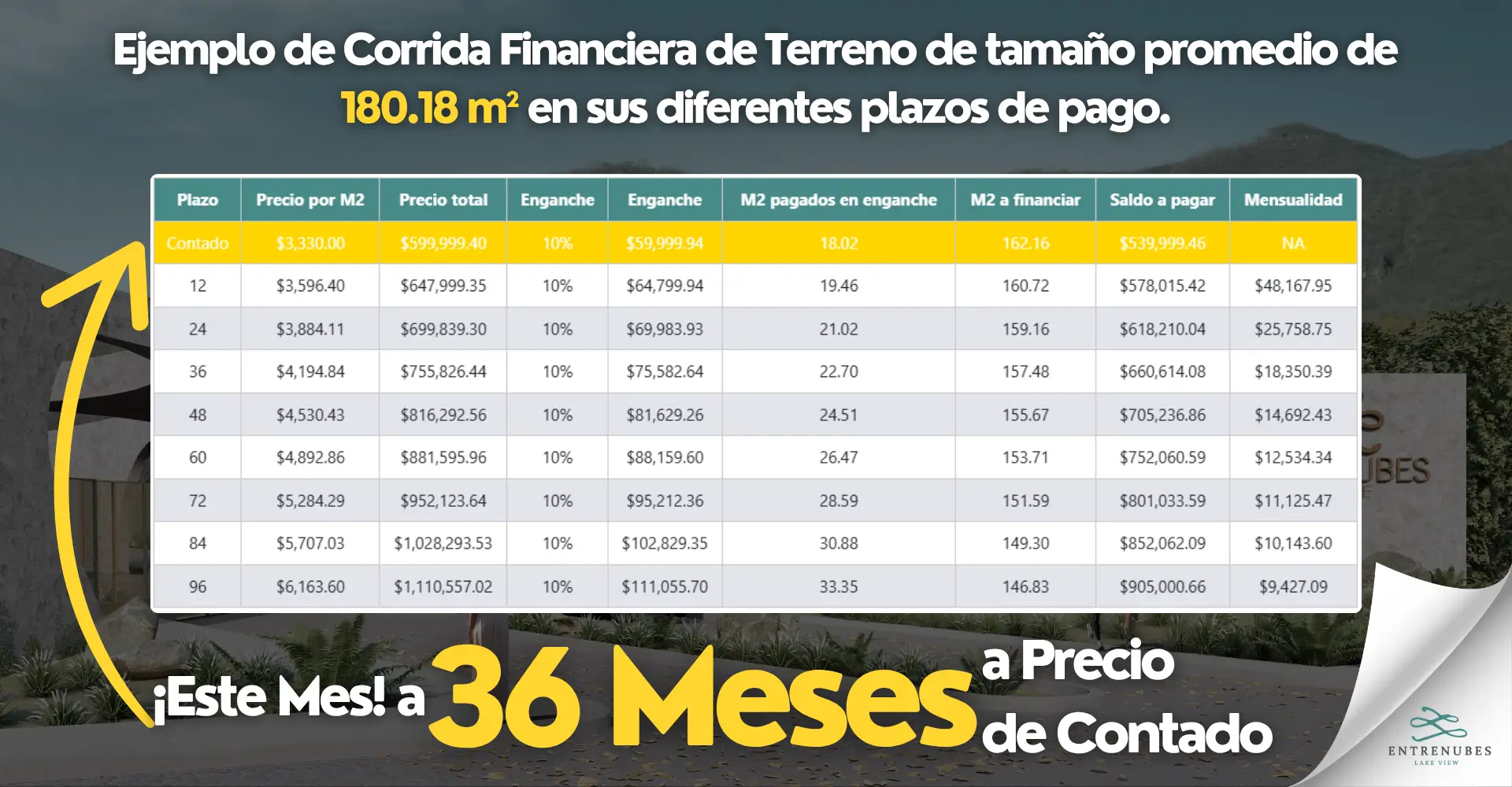 En ENTRENUBES LAKE VIEW, ofrecemos flexibilidad en nuestros planes de pago. Ya sea que prefieras adquirir tu terreno de Contado para asegurar tu inversión, o desees disfrutar de la comodidad de pago a plazos.